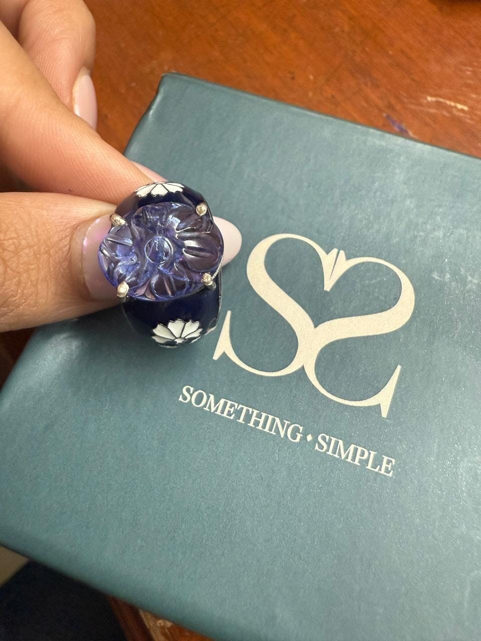 This one-of-a-kind piece is inspired by the rich heritage of Jaipur, with the vibrant blue pottery colors and intricate patterns influencing its design. The beautifully carved tanzanite at its centre, complemented by the use of French enamel, enhances its striking statement appeal.