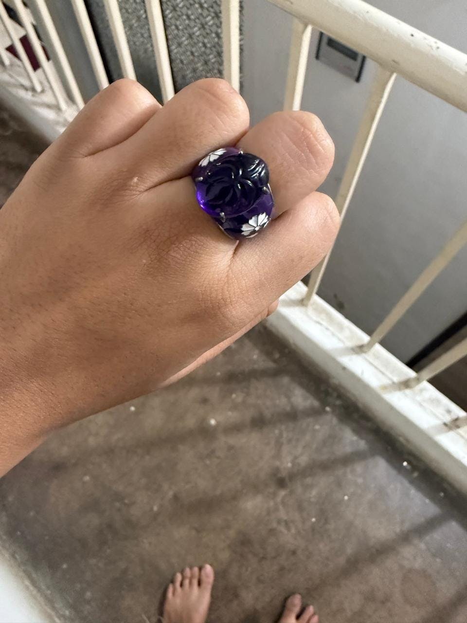 This ring features a hand-carved Amethyst cabochon, set against intricate enamel detailing inspired by the timeless motifs of Jaipur’s blue pottery art.