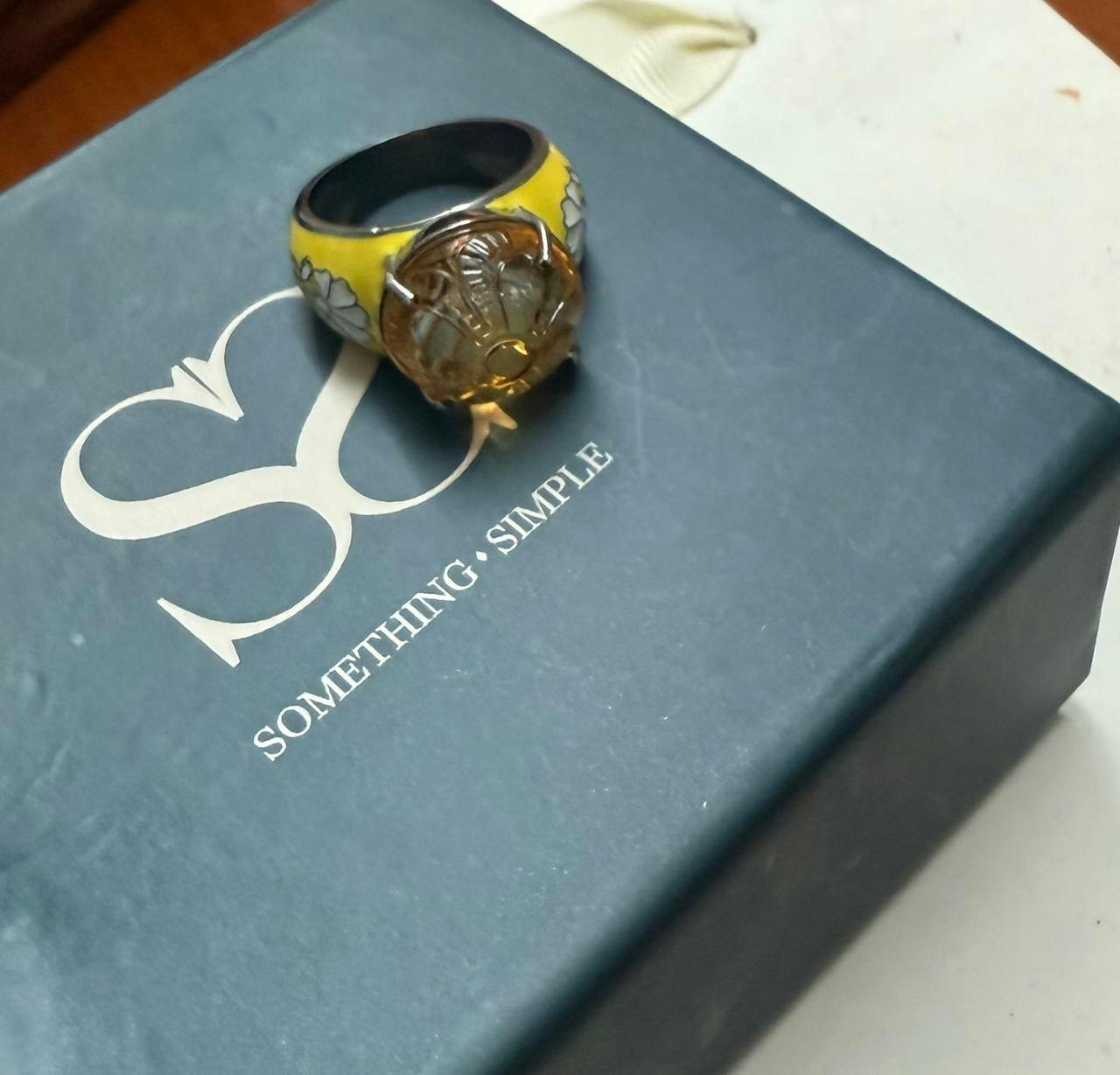 This ring features a hand-carved Citrine cabochon, set against intricate enamel detailing inspired by the timeless motifs of Jaipur’s blue pottery art.